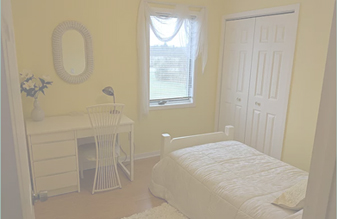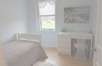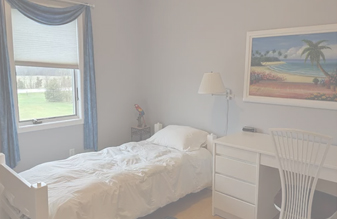 The Galatians Room has a Lake Michigan feel to it, decorated in pale grays and blues. It features a twin bed, desk, and nightstand and is located upstairs on the west side of the house with a view of the Michigan sunsets in the evening!