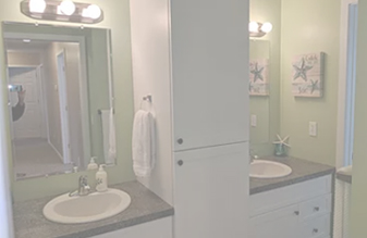 This bathroom features 2 sinks in the middle, with a full bath/shower room on one end and a small toilet room on the other end, allowing for shared use and access by the 3 health and healing room occupants upstairs.
